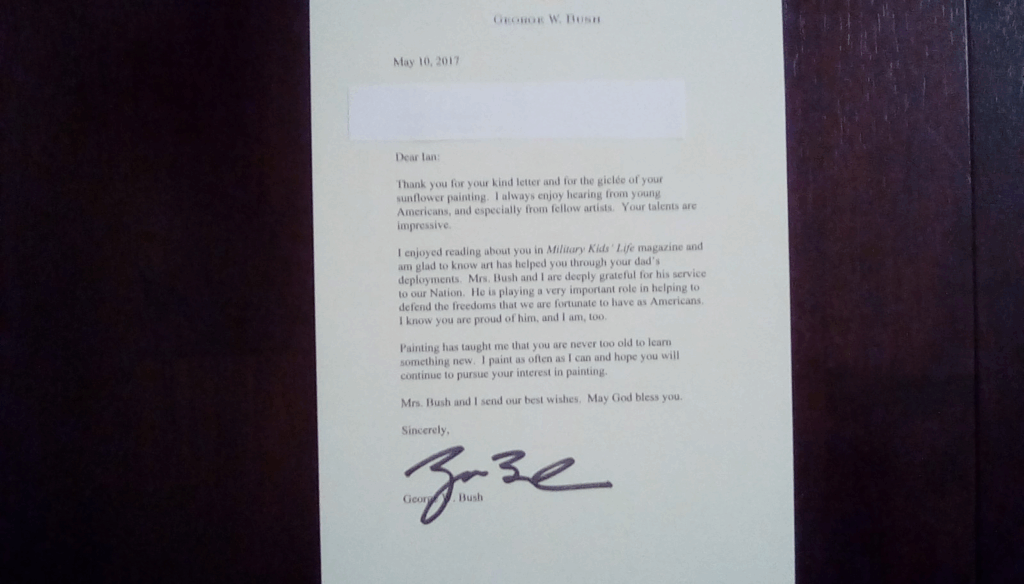 Upon seeing a news piece regarding President George W. Bush’s passion for painting, Ian promptly expressed his desire to send Bush one of his own artworks. This is why we sent a image along with a letter from our family. A few weeks later, to our surprise, a letter from President Bush arrived. Ian was overjoyed. Initially, we began something small and genuine to express kindness and thankfulness, but it evolved into a much larger endeavor.