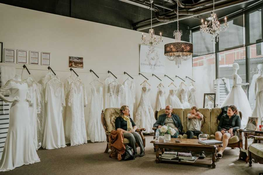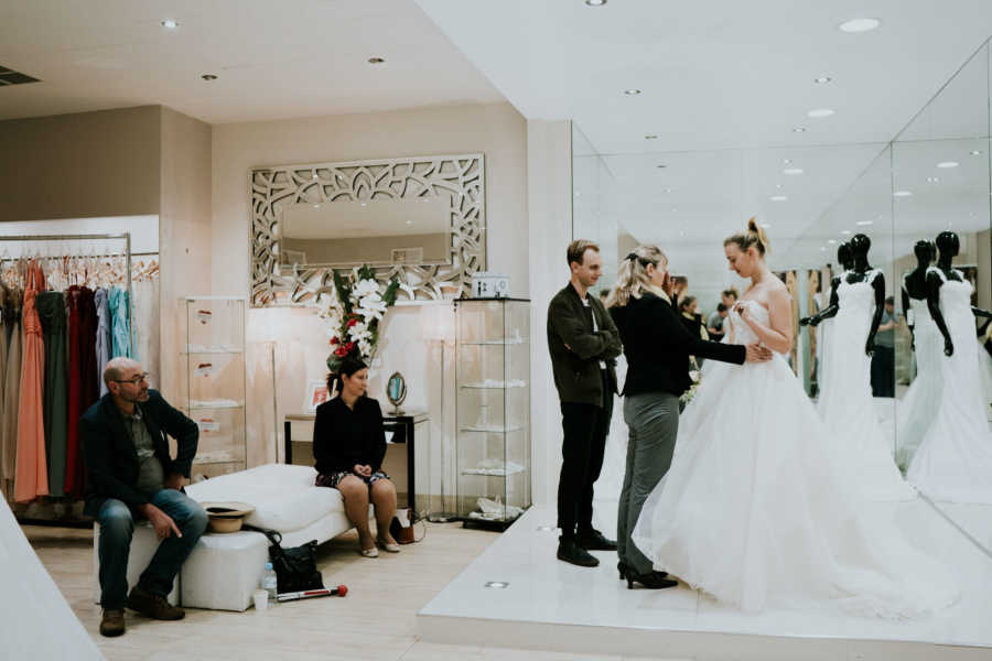 The biggest hurdle, however, was finding her dress. Without being able to browse photos or see herself in a mirror, Stephanie dreaded the process. But supported by her mom, bridesmaid, brother, dad, photographer James Day, and videographer Sean Tolhoek, who documented the journey, she found a way. Each time she stepped into a dress, her mom was guided to feel its details as the assistants described it. Stephanie touched the fabrics herself, paying attention to texture, comfort, and how each gown moved.