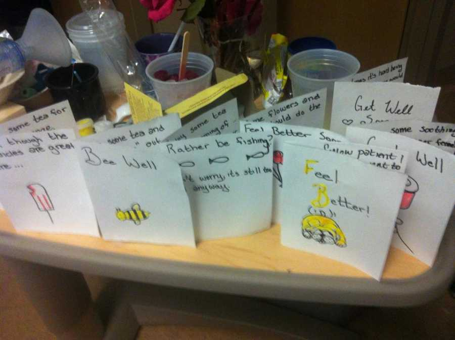 Then came the walk. Too weak to stand for long, she still dragged her IV pole through the hallway, trying to make sense of the chaos. The ward was lined with glass rooms, each holding a patient alone, pale, and motionless. By contrast, her room was full of color and small comforts, tea bags, Jell-O cups, her blanket, and clothes. She felt humbled. That realization sparked something inside her. She returned, picked up her pencil crayons, and began making cards for the other patients. Silly doodles of bees and fishing poles, taped tea bags, messages like “Bee Well.” They were small tokens but carried the kind of kindness that keeps a soul alive.