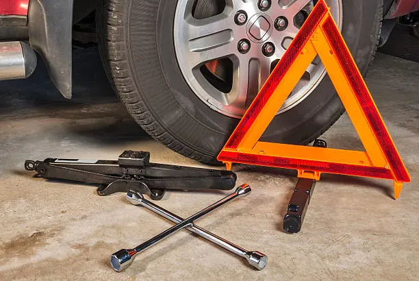 A safety triangle should be used if one ever changes a tire along a highway. Other tire changing tools include a car jack and lug wrench.