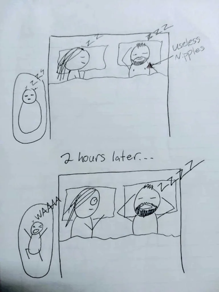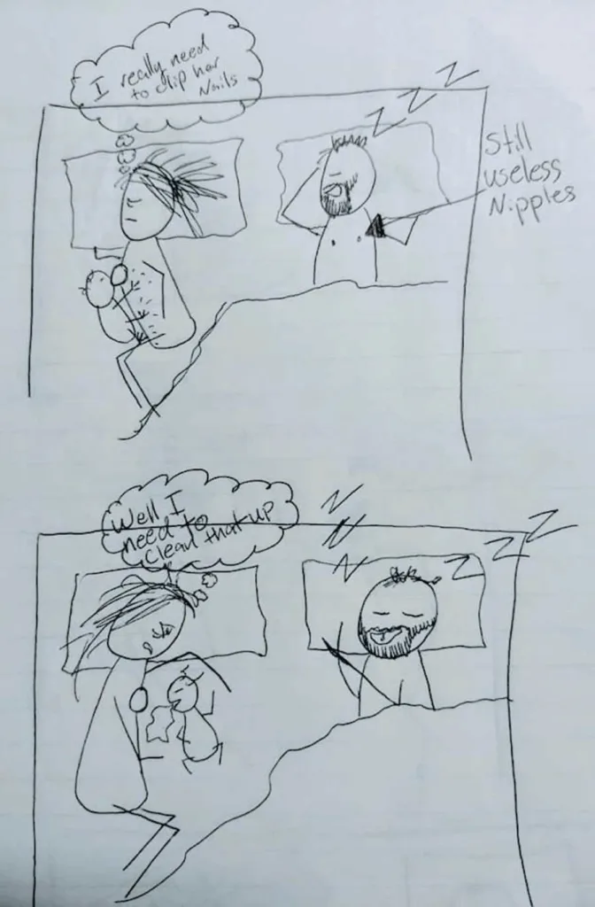 Mattea shared the drawings online, hoping to give other moms a chuckle. She thought a few friends might see it, maybe a handful of fellow sleep-deprived parents who could relate. But the internet had other plans. Within days, her simple sketch had been shared thousands of times. Moms from all over the world commented that it felt like she had drawn their nights. Some tagged their partners, some laughed, and some admitted they cried a little too.