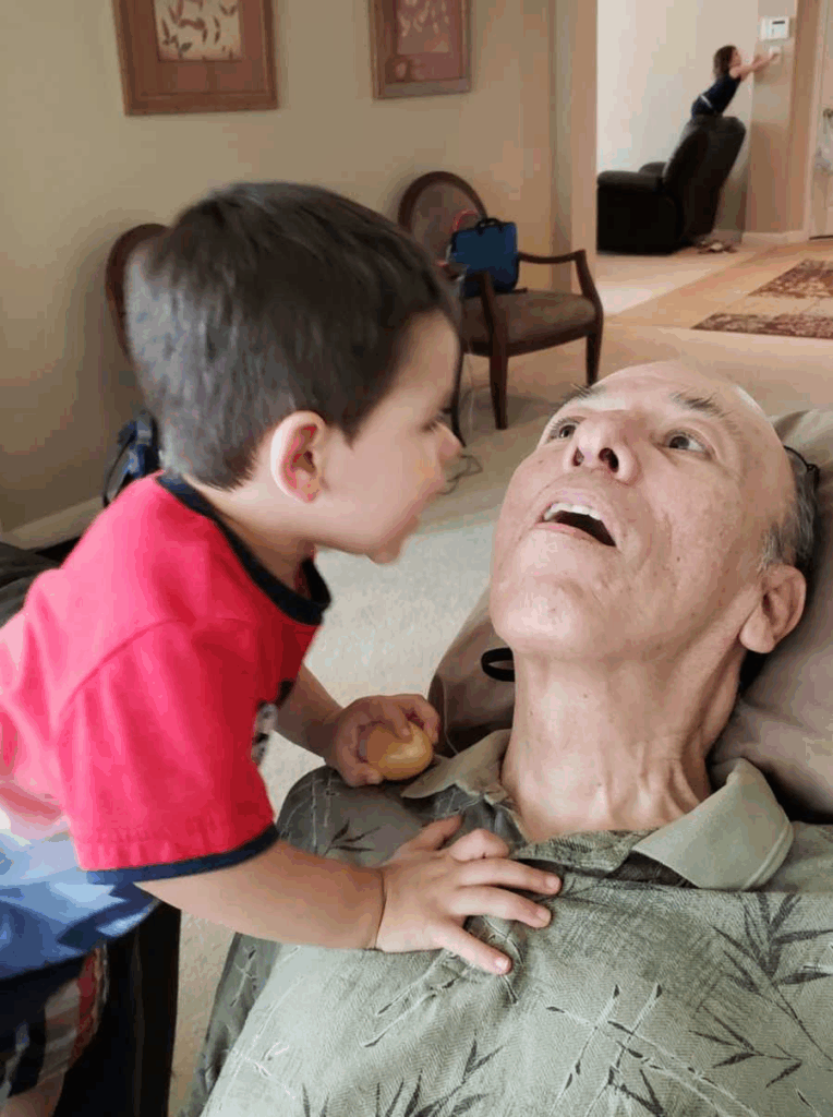 Every holiday feels precious now, every birthday another victory. The disease keeps moving forward, weakening his muscles and stealing his independence, but his spirit refuses to dim. He can no longer hold his new great-grandson or toss a ball with the little ones, and that loss cuts deep. Still, he leans in for kisses, still makes sure his family knows how loved they are. And they, in turn, surround him with constant care.