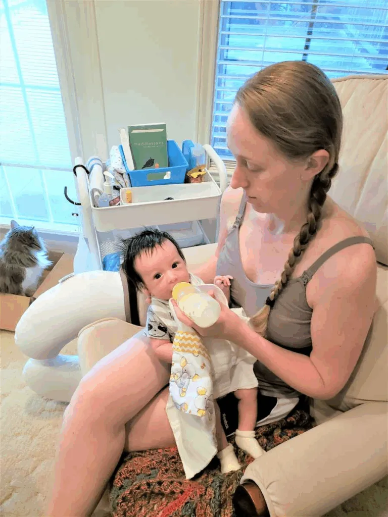 Instead, her milk didn’t come in as expected. When their four-day-old had a dry diaper for nine hours, panic took over. They rushed to the ER, and he was admitted to the NICU for two days. One bottle might have prevented it, she thinks now, but they were both fresh from surgery, sleep-starved, and overwhelmed. He recovered well, but the fear around feeding settled deep and lasted fifteen months.