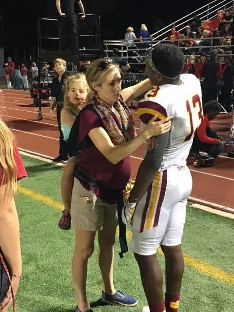 The image shows her on the sidelines of a high school football game, belly 35 weeks pregnant, clipboard in hand, radiating determination. In the background, the Friday night lights glow on Putnam City North High School, illuminating a scene of teamwork, perseverance, and a mother unwilling to let circumstances hold her back. Megan posted the photo with a candid caption: “Sports Medicine Doctor Mom, this is what happens when you are 35 weeks pregnant, husband leaves town for the weekend, childcare for 3-year-old falls through, and you have a game to cover!”