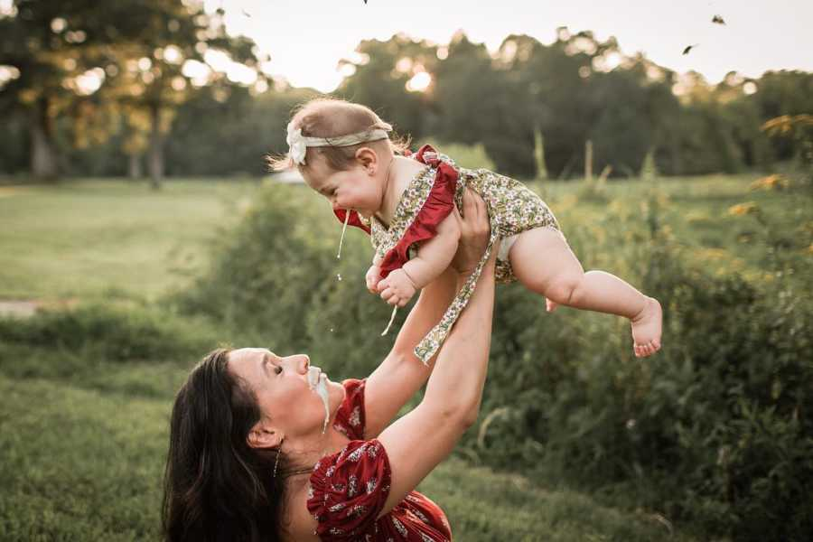 Emilia had eaten about an hour before the shoot, so Gina thought she was safe. But Emilia had a reputation in the family—she was a “serial spitter.” Still, optimism is a powerful force in motherhood, so Gina lifted her baby high for one last photo while their two-year-old started melting down. The light was perfect, the moment sweet, and the photographer encouraged, “Just one more shot!” Gina smiled widely, ready for the perfect picture.