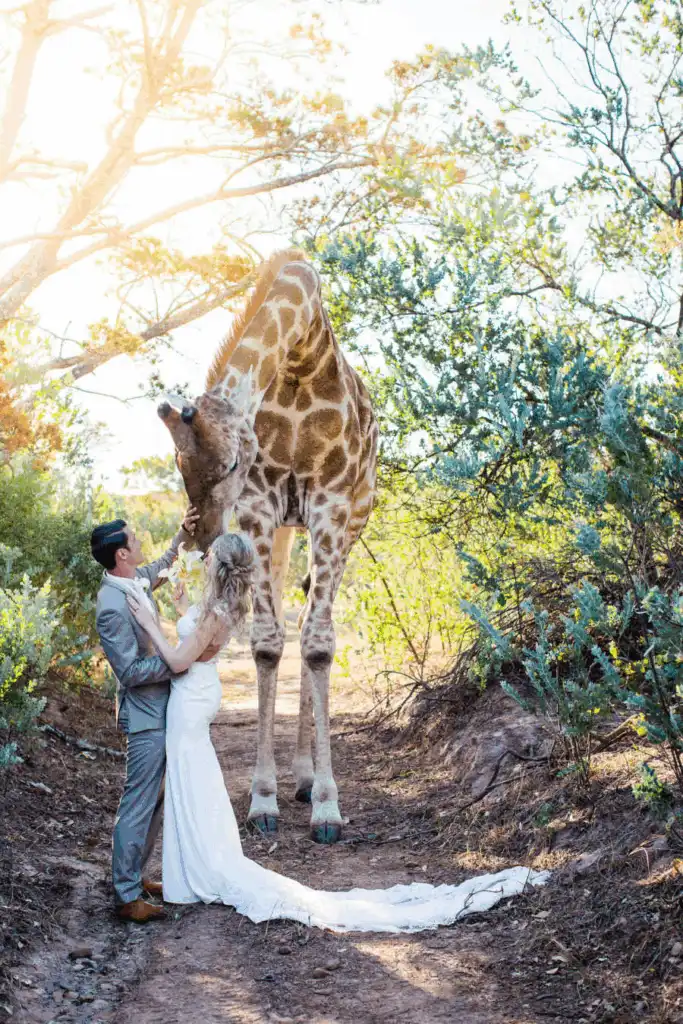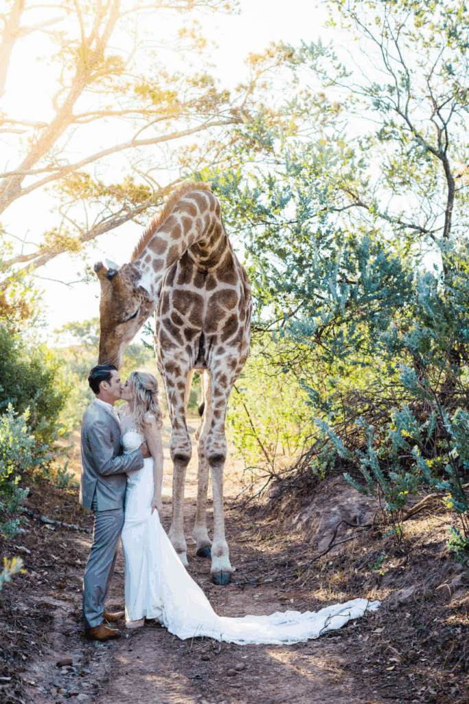 Stephanie couldn’t stop thinking about it as she went through the photos later that night. The gentle giant looked like he had wandered in from another world to remind them all that love comes in the most unexpected ways. The images spoke louder than words: a bride, a groom, and a giraffe sharing a brief, perfect connection under the African sun. It wasn’t planned or posed, but it was real, and maybe that’s what made it so unforgettable. In the end, it didn’t feel like a photobomb at all. It felt like a natural blessing, a reminder that joy can arrive unannounced, with long legs, kind eyes, and a heart as big as the sky.