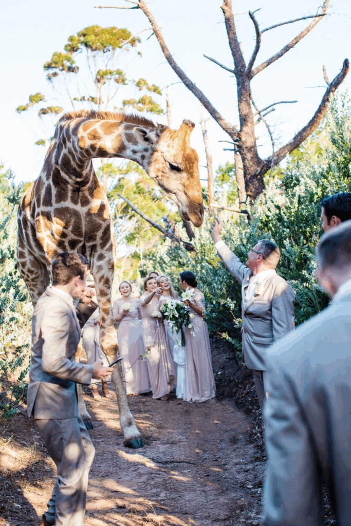 The photographer, Stephanie Norman, was in the middle of snapping bridal portraits when it happened. One moment, the wedding party was posing among the trees, the next, a giraffe’s enormous head appeared above the branches as if to ask what all the fuss was about. Everyone froze. The bridesmaids scattered toward the bushes, the groomsmen ducked down the path, and Luke and Tristan stood there, grinning at this towering creature joining their wedding.