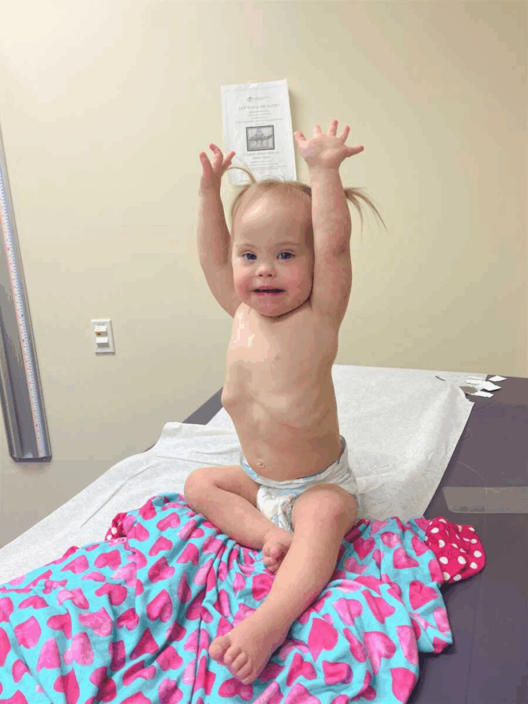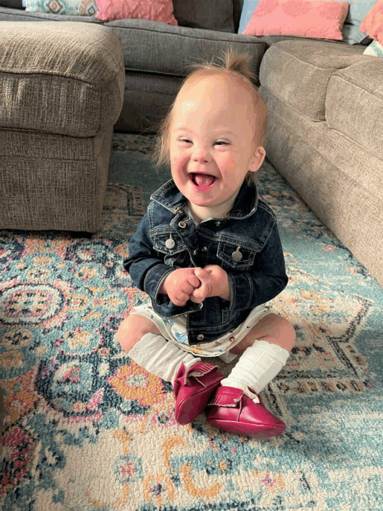 She cried right away. I remember thinking, She’s here. She’s okay. But then her color turned gray. They rushed her to give oxygen, and she spent her first week of life in the NICU. That’s where we learned she had a congenital heart defect an AVSD that would require open-heart surgery. Doctors also pointed out features associated with Down syndrome.
